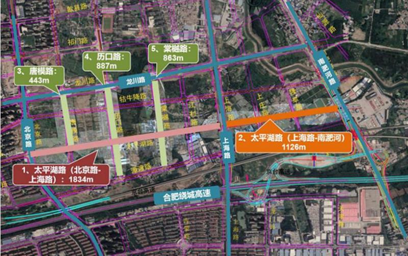 太平湖路西起北京路,向東與上海路相交,終至南淝河,全長2.96公里,路幅寬40米。歷口路北起龍川路,向南與太平湖路相交,終至潭渡路,長887米,路幅寬45米。